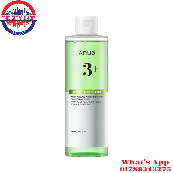 The ANUA Azelaic Acid 3 Cica Skin Clarifying Toner 250ml is a lightweight, non-comedogenic toner designed to soothe irritated, blemish-prone skin, reduce redness, and refine skin texture.