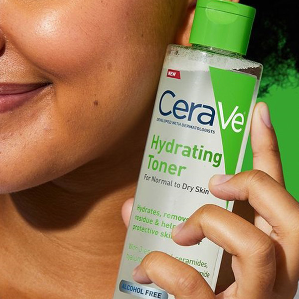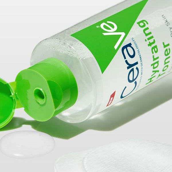 - After cleansing your face, pour a small amount of Cerave Hydrating Toner onto a cotton pad.