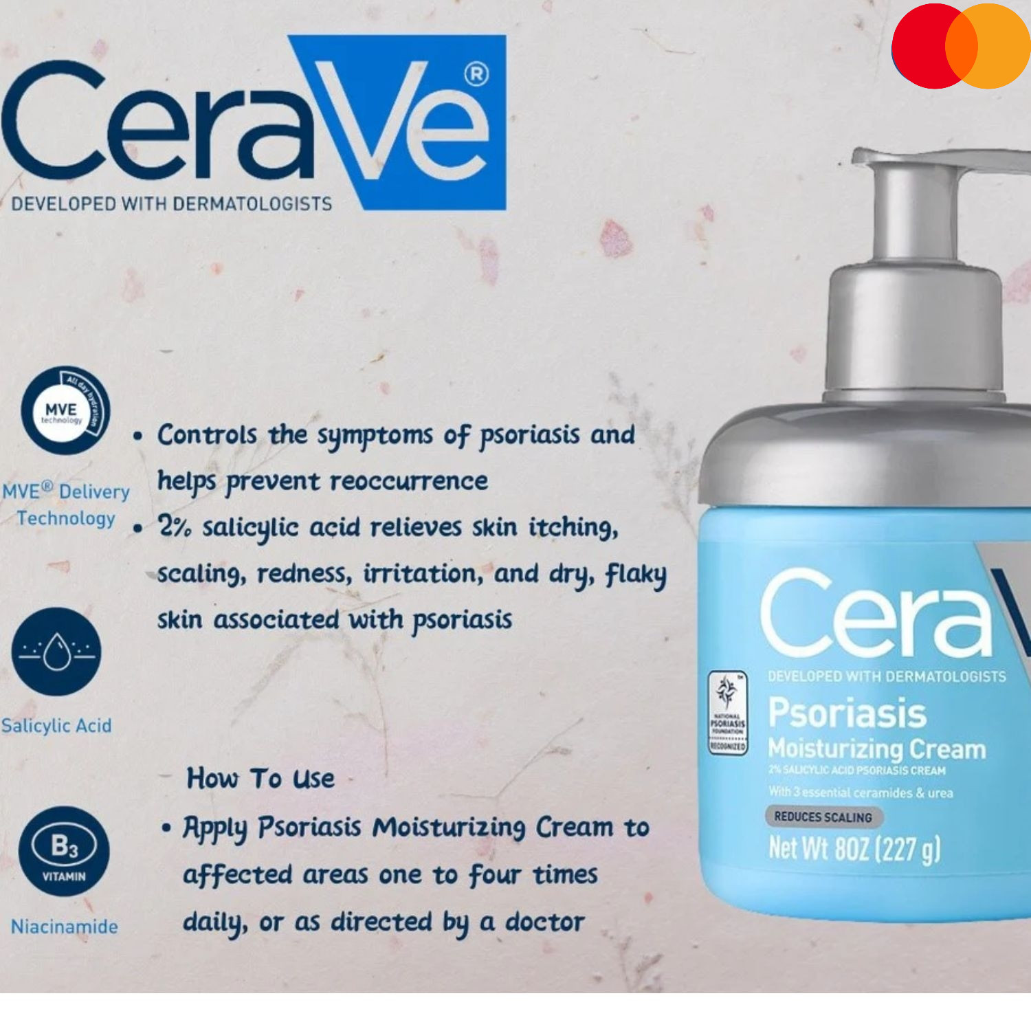 CeraVe Psoriasis Moisturizing Cream was developed with dermatologists to help alleviate the symptoms of psoriasis and moisturize dry skin while helping to reduce skin scaling and itching. With 2% salicylic acid to provide relief from psoriasis symptoms, lactic acid for mild exfoliation, 3 essential ceramides that work together to lock in skins moisture and help restore your skin’s protective barrier, moisturizing shea butter and urea, plus niacinamide, our non-irritating psoriasis moisturizer can help you get the relief you need. In addition, our patented MVE technology encapsulates ceramides to ensure efficient delivery within the skin’s barrier and slow release over time. Supporting your protective skin barrier, long after you’ve finish applying.