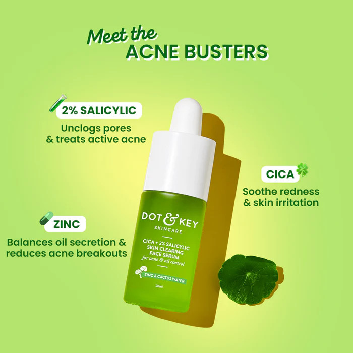 Banish breakouts with Dot & Key Cica + 2% Salicylic Serum, your go-to solution for clear, healthy skin. Formulated with 2% salicylic acid, this daily-use serum dives deep into pores to eliminate excess oil, unclog congestion, and tackle acne-causing bacteria. Infused with the calming power of Centella Asiatica (Cica), it soothes redness, reduces irritation, and helps restore balance to sensitive and acne-prone skin. The lightweight, non-sticky texture ensures quick absorption, making it perfect for oily skin types. This multitasking serum also targets blackheads and whiteheads, preventing future breakouts for a smooth, blemish-free complexion. Use it daily for calm, clear, and confident skin!