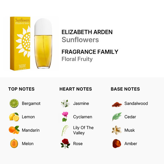 Elizabeth Arden Sunflowers Perfume, The sweet, citrusy fragrance of Sunflowers perfume is perfect for all-day wear during the spring and summer. The combination of fruity notes and hints of florals produce a light, refreshing fragrance that is sure to delight the wearer. Opening with top notes of melon, mandarin orange, rosewood, lemon, orange blossom, bergamot, and peach, this perfume has a fruity overtone with splashes of zesty citrus and a hint of woodiness. Middle notes of jasmine, cyclamen, orris root, Osmanthus, and rose deepen the floral accord. This perfume is anchored with earth undertones of oakmoss, cedar, sandalwood, musk, and amber. The perfume was launched in 1993.