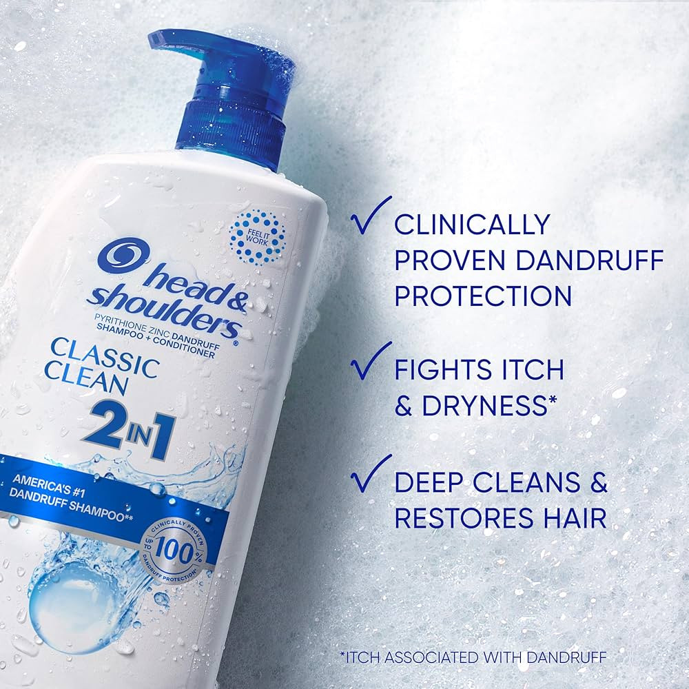 Ignite your senses and feel it working with every wash. Brought to you by the #1 dermatologist-recommended brand in America, Head and Shoulders Classic Clean 2-in-1 formula is your shower essential that is Clinically proven to relieve dry, itchy scalp+ and protect against flakes, itch,+ oil^ and dryness. Classic Clean 2-in-1 anti-dandruff shampoo and conditioner works 7 surface layers deep to ensure that your scalp feels clean and healthy, while your locks shine. Featuring the light, clean scent you know and love, Classic Clean 2-in-1 formula cleans and conditions hair all at once while our unique formula, with pyrithione zinc, delivers multiple healthy scalp and hair benefits:Fights drynessCalms itching+Relieves irritation+Reduces redness+Controls oiliness^Removes flakes+^* visible flakes; with regular use** based on volume of sales+ associated with dandruff^ washes away oil and flakes shampoo + conditioner system vs. non-conditioning shampoo