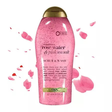 - Gently exfoliate and nourish skin with OGX Rosewater & Pink Sea Salt Wash & Scrub, featuring calming rosewater and lightly buffing sea salt.