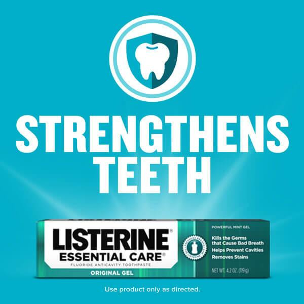 Listerine Essential Care Original Gel Fluoride Toothpaste provides advanced oral care to keep your teeth strong and your gums healthy. This toothpaste is designed to deliver a deep cleaning experience while protecting your teeth from cavities and promoting long-lasting fresh breath. Its powerful fluoride formula offers multiple benefits: