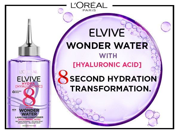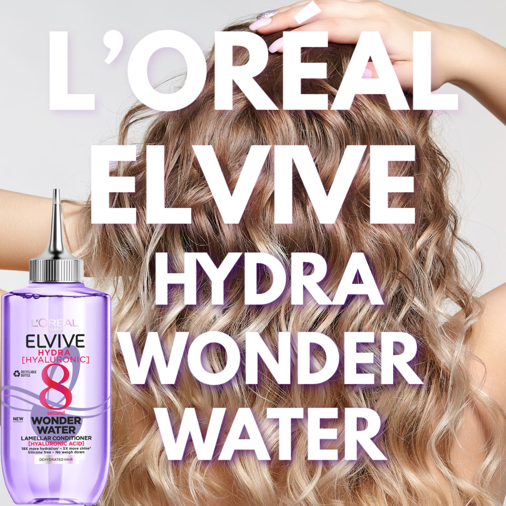 Hyaluronic Acid, for your hair. Transform dehydrated hair in 8 seconds with Elvive Hydra [Hyaluronic] 8 Second Wonder Water from L'Oréal Paris. A skincare-inspired rinse-out liquid conditioner with Hyaluronic Acid. Hair looks plumped, bouncy and up to 5x shinier¹. The ultra-lightweight, silicone-free formula is powered by breakthrough Lamellar Water Technology and infused with a shot of Hyaluronic Acid. It forms a film of care around the fibre to smooth hair and maintain a healthy look. Hair is visibly transformed with an instant and intense feeling of hydration, a glassy shine, and a silky touch. It works wonders in just 8 seconds. Effective on all hair types, ranging from thin, fine to thick, curly textures. Scientifically designed for dry, damaged, and dehydrated hair. The silicone-free² formula provides no weigh-down, even for ultra-fine hair.