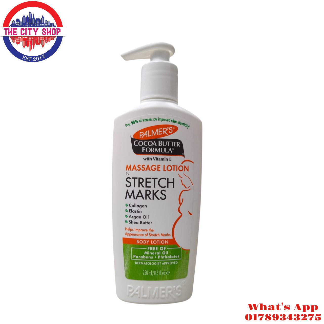 Palmer’s Cocoa Butter Formula Massage Lotion helps visibly improve skin elasticity and reduce the appearance of stretch marks.Pure Cocoa Butter and Shea Butter, Natural Oils,Collagen,Elastin,and Lutein keep skin moisturized and supple for 48 hours allowing skin to stretch more easily.Widely recommened for stretch marks during and after pregnancy or weight fluctuation.This non-greasy lotion is ideal for all over body use,in place of your regular moisturizer.